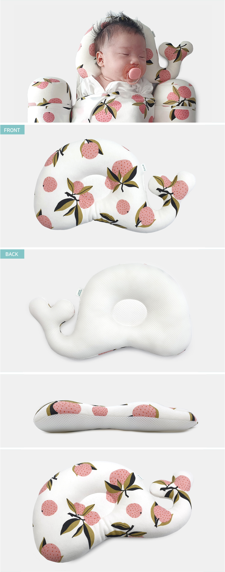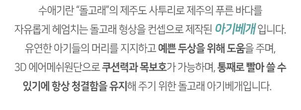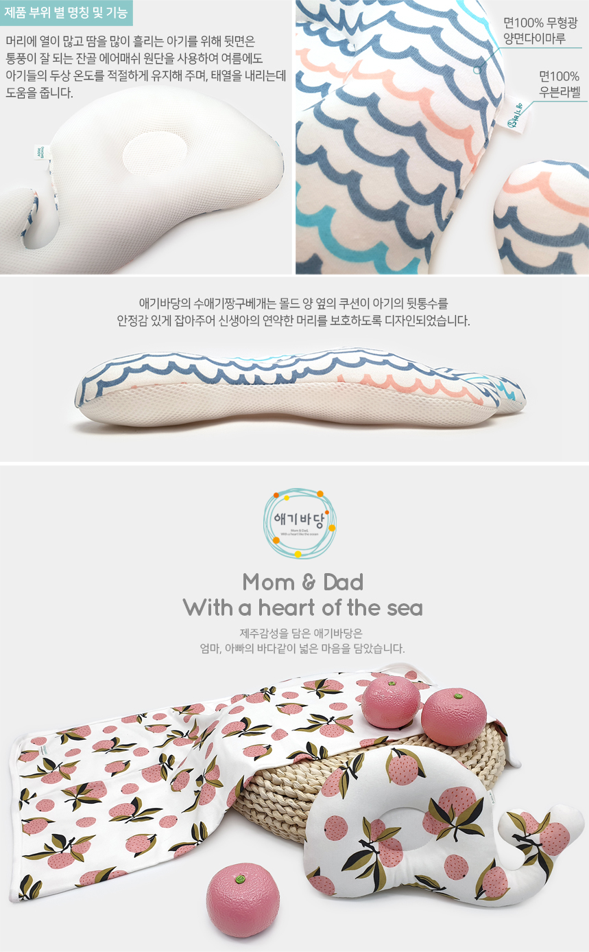 수애기란 “돌고래”의 제주도 사투리로 제주의 푸른 바다를 자유롭게 헤엄치는 돌고래 형상을 컨셉으로 제작된 아기베개입니다. 유연한 아기들의 머리를 지지하고 예쁜 두상을 위해 도움을 주며, 3D 에어메쉬원단으로 쿠션력과 목보호가 가능하며, 통째로 빨아 쓸 수 있기에 항상 청결함을 유지해 주기 위한 돌고래 아기베개입니다.